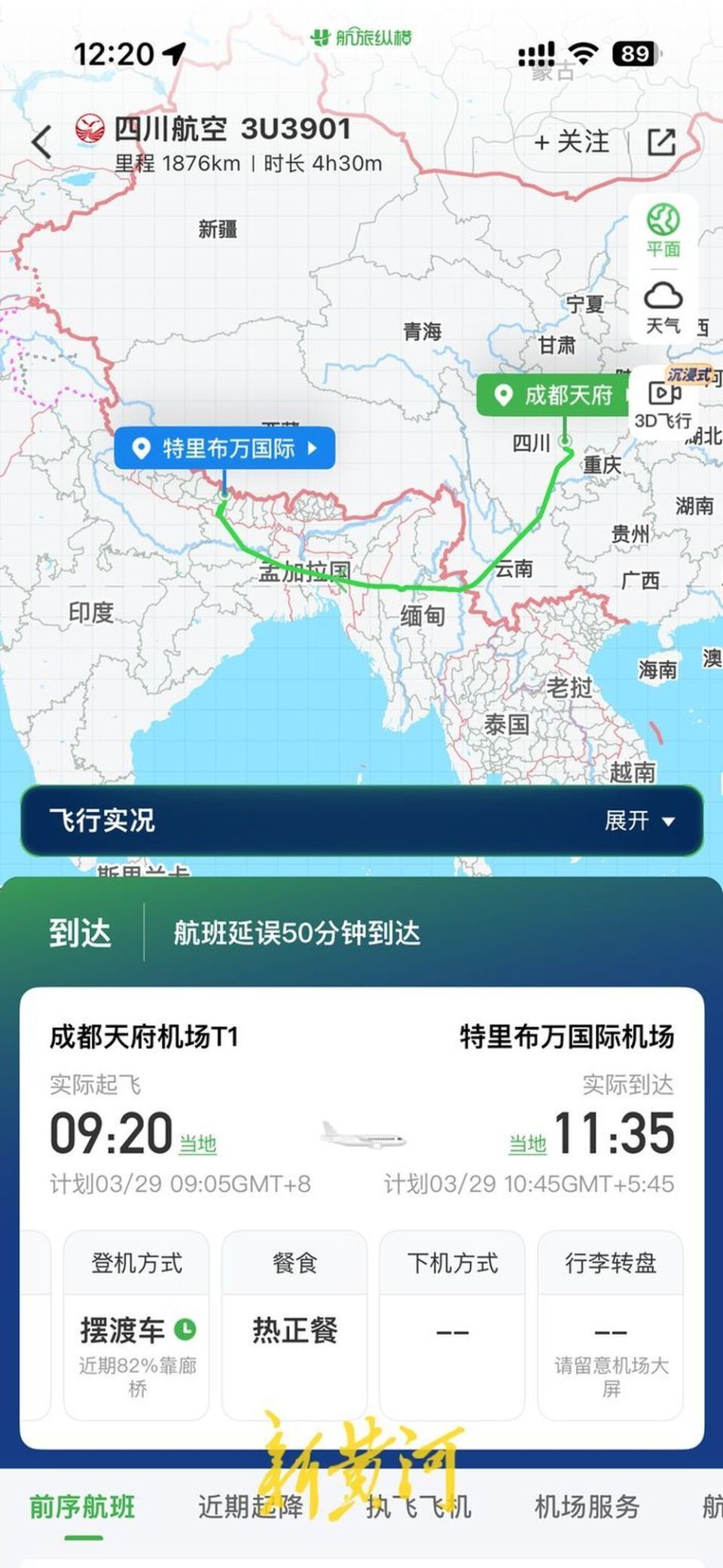 航旅纵横深化,3U3901航班于3月29日9时20分从成王人天府机场升起,11时35分抵达加德满王人特里布万海外机场,该航班延误50分钟抵达。