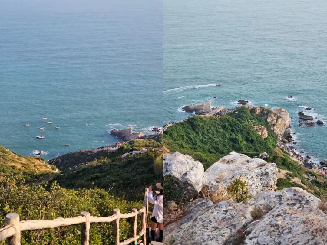 沿着栈说念往下走,全程皆是那种“之”字形的台阶,修在峭壁边上,一齐往下通向海边。台阶不少,从山顶走到海边大纲目20来分钟,但每下一段就能看到不一样的自得。
