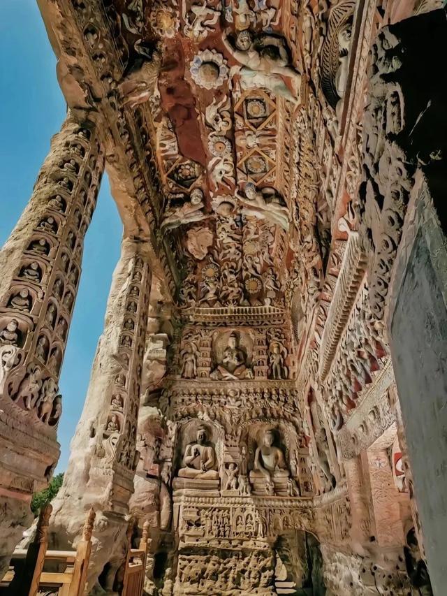 云冈石窟是来大同的第一站。这不单是是一座石窟,更是北魏王朝举国之力留住的艺术巅峰。站在第20窟的露天大佛前,13米多高的佛像,样子丰满饱和,嘴角噙着一抹悲悯的浅笑,静静地坐了一千五百多年,看尽了王朝更替、世事变迁。往里走,第5、6窟是云冈的精华,窟顶的藻井雕镂着繁复的莲花与飞天,色调虽已斑驳,却照旧能窥见以前的丽都。第12窟俗称“音乐窟”,窟顶雕镂着各式手合手乐器的飞天伎乐,有的吹笛,有的弹琵琶,有的击饱读,像一场永不拆伙的玉阙音乐会,在悲怆的石窟里,仿佛还能听见千年前的乐声。