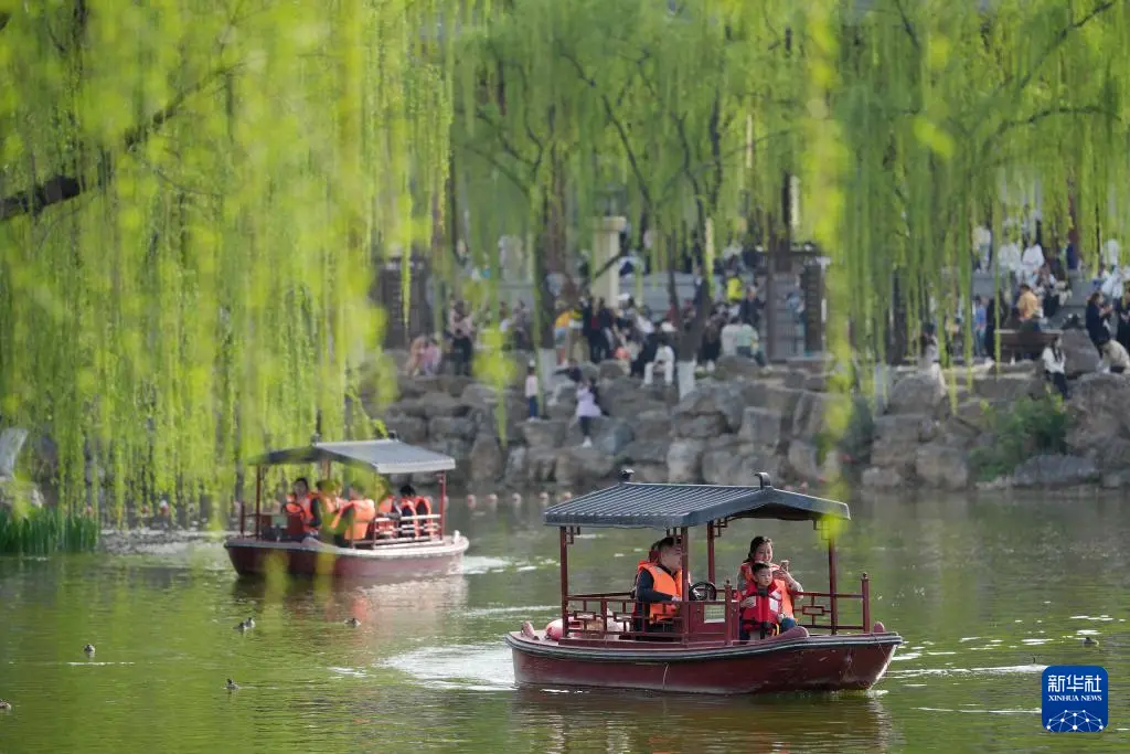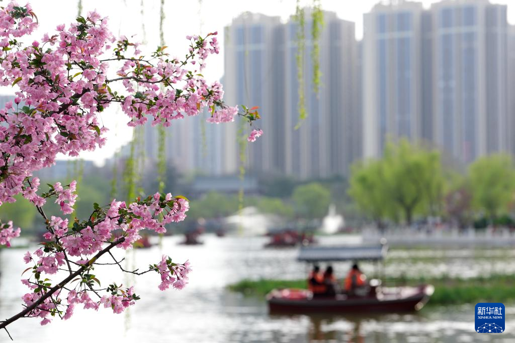 3月28日,游东谈主在西安市兴庆宫公园泛舟赏春。