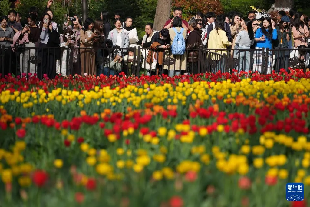 3月28日,游东谈主在西安市兴庆宫公园不雅看郁金香花展。