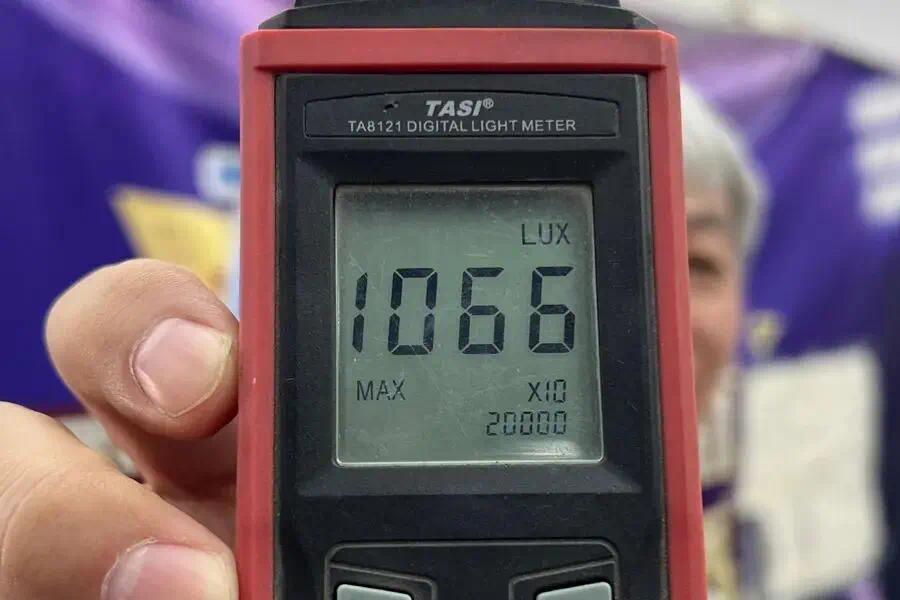 测试形势:以车灯最前端为基点,与垂直墙面相距2米距离,在发动机广博使命情景下进行测试,使用色泽照度计取近光灯照明范畴内的最大值。