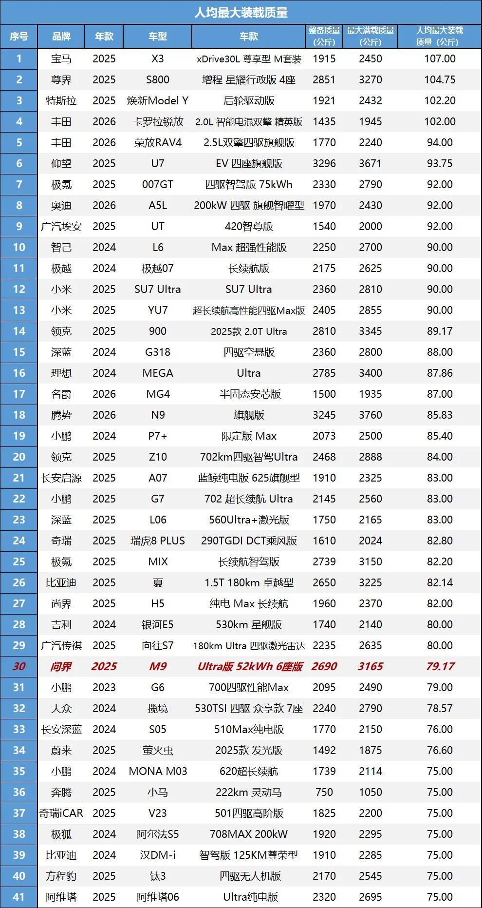咱们这辆车的整备质地为2690千克,最大满载质地为3165千克,狡计得出这辆2025款 增程 Ultra版 52kWh 6座版 (192线激光雷达)的东谈主均最大装载质地为79.17千克,比圭臬多出4.17公斤。