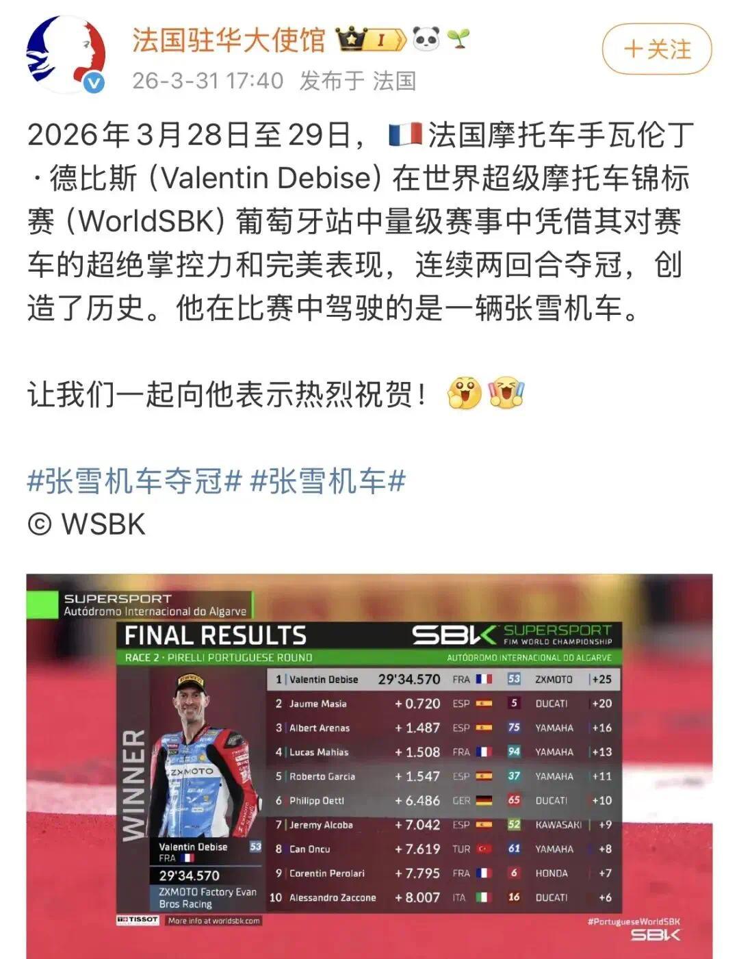 近日,法国驻华大使馆发帖道贺法国车手瓦伦丁·德比斯(Valentin Debise)活着界超等摩托车锦标赛WSBK葡萄牙站中量级赛事中凭借其对赛车的超绝掌控力和无缺发达,衔接两回合夺冠。这亦然法国大使馆初度道贺摩托车手,况兼还仅仅分站领奖台。畴前只见过土耳其大使馆发帖道贺他们国度的车手得回年度冠军。