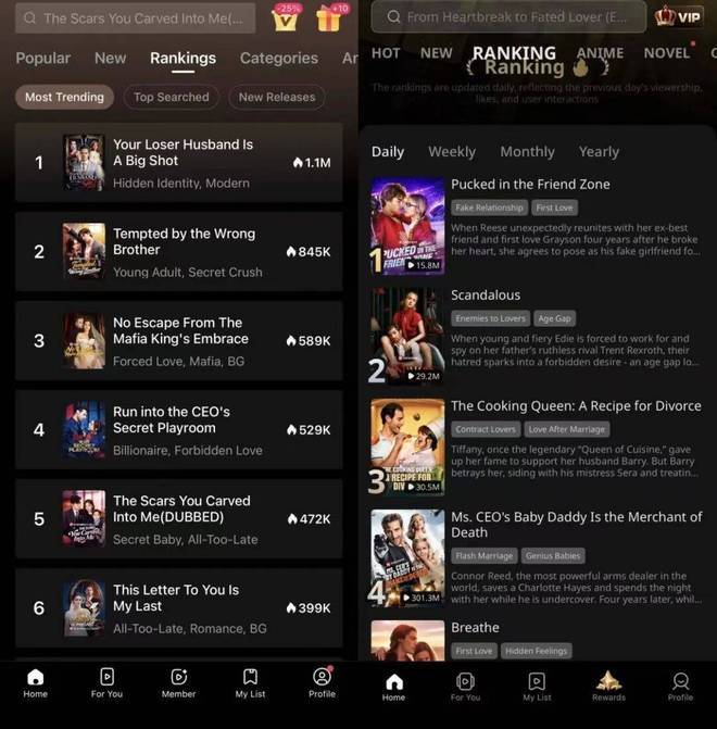 咱们不雅察了DramaBox、ReelShort英文版块的热点短剧排名榜单,面前高热神志如故积累于合同婚配、身份回转、权门秉承、复仇逆袭等高转念题材。不外在这个基础上,面前很多高热神志也融入了狼东谈主、校园、师生等更面临西洋用户语境的设定。
