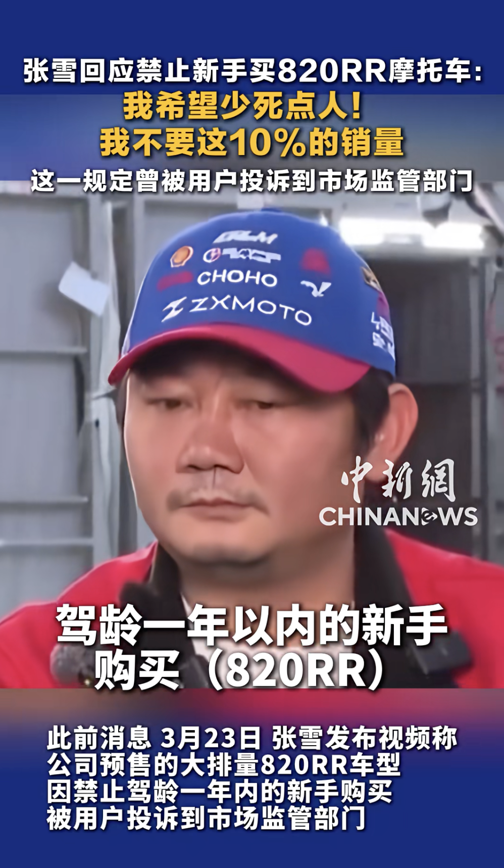据中国新闻网音问,张雪机车因辞谢驾龄一年内的生手购买预售的大排量820RR车型,而被用户投诉到市集监管部门。他回话称:“我但愿少死几个东说念主,我不要这10%销售量,公司也不会死。”