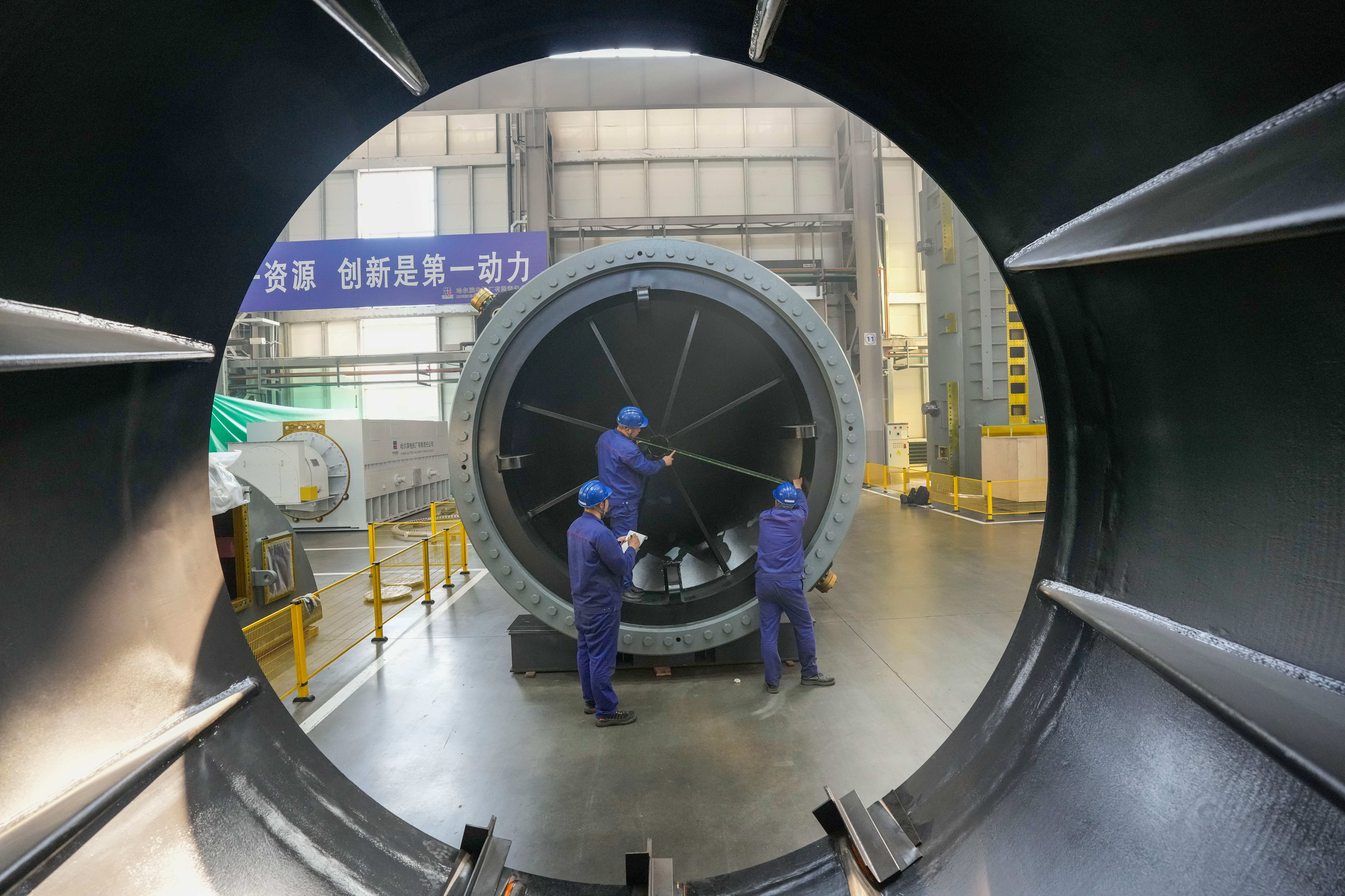 这是3月31日在哈电集团哈尔滨电机厂有限遭殃公司拍摄的该公司自主研制的巨型水电泄压阀。