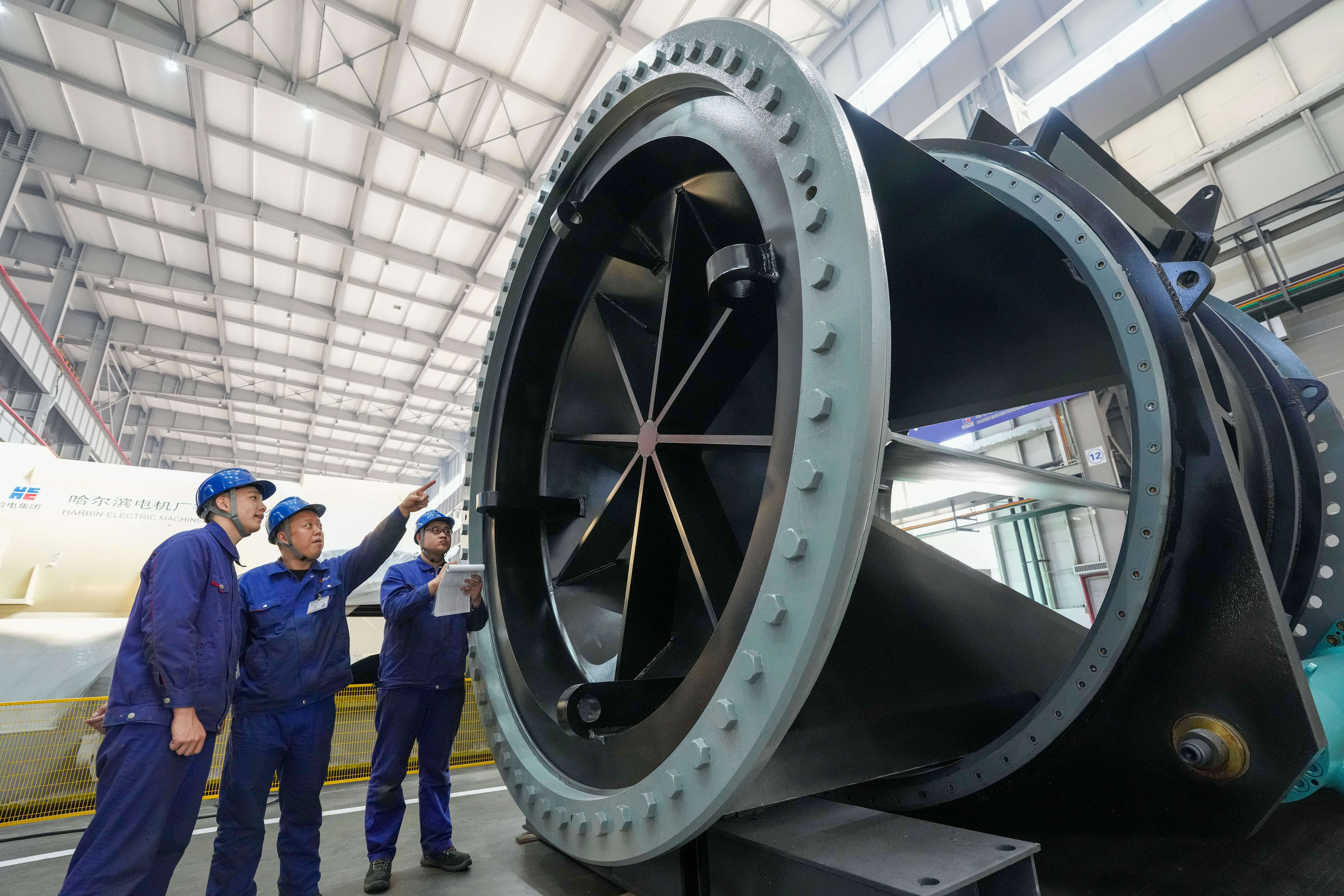 这是3月31日在哈电集团哈尔滨电机厂有限株连公司拍摄的该公司自主研制的巨型水电泄压阀。