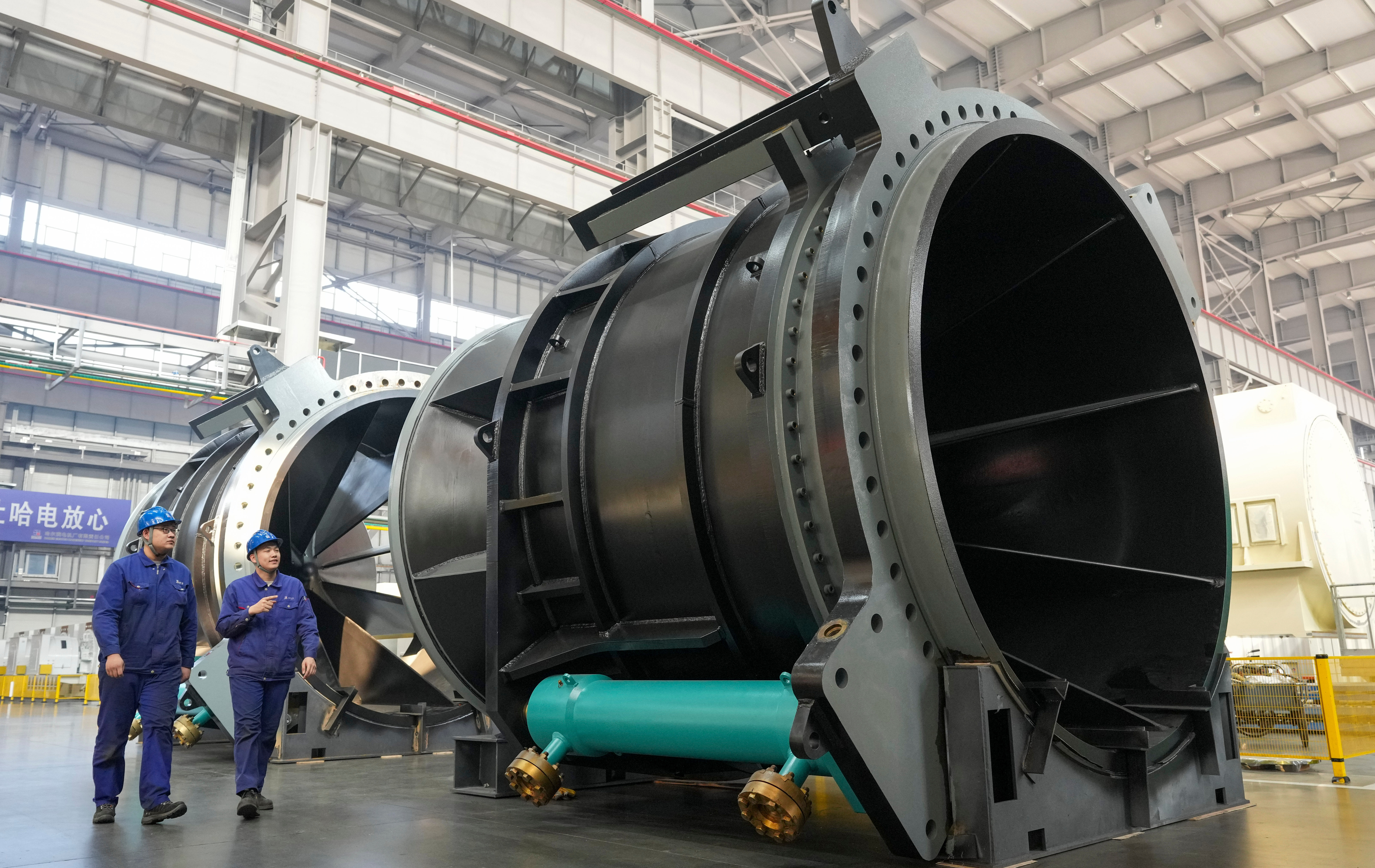 这是3月31日在哈电集团哈尔滨电机厂有限包袱公司拍摄的该公司自主研制的巨型水电泄压阀。