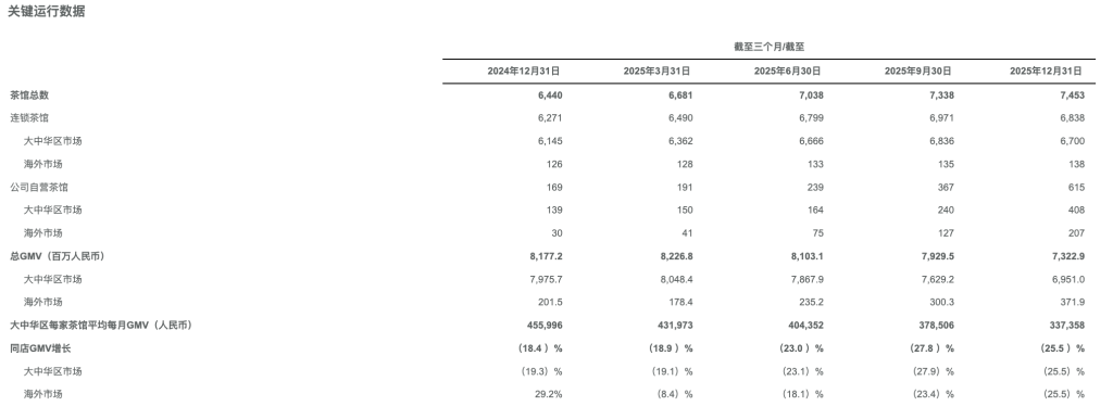 财报自满,去年全年,霸王茶姬GMV(总交游额)为315.8亿元,同比增长7.2%。去年第四季度,GMV为73.23亿元,据规划同比着落超一成。同店GMV增速为-25.5%,上年同期为-18.4%。从地域上看,大中华区商场GMV为69.51亿元,据规划同比下滑超一成。大中华区每家茶肆的平均月交游额为33.74万元,据规划同比下滑26%。