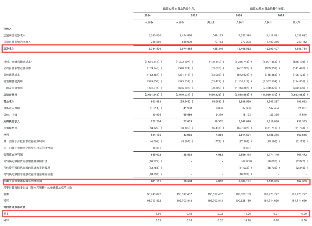 3月31日晚间,霸王茶姬(NASDAQ:CHA)公布了2025年第四季度及全年龄迹数据。2025年全年,净收入同比增长4%至129.07亿元。营业利润为13.47亿元,据规划同比降53.33%。全年归母净利润为11.35亿元,据规划同比下滑52.4%。非GAAP净利润为19.1亿元,据规划同比降超两成。每股宽敞股基本收益为6.27元,据规划同比着落56%。