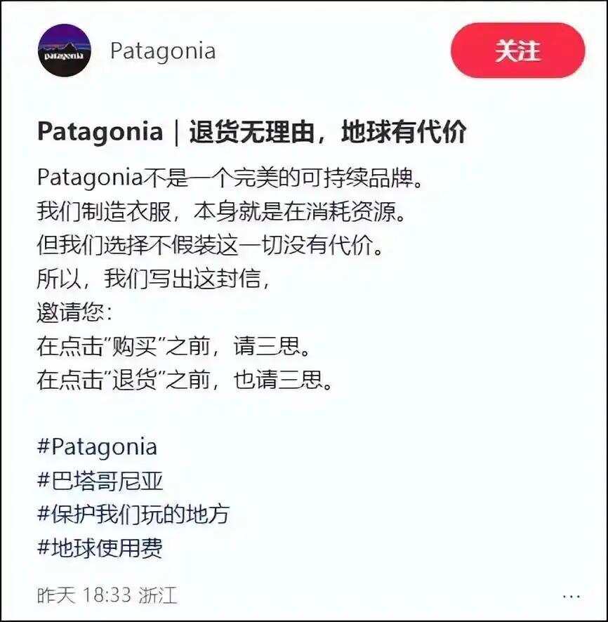 近日,户外品牌Patagonia在天猫旗舰店推出“地球使用费”运脚计谋,以“公开物流环境资本”“弥补碳排放”为名,向消费者预收首件15元、每加一件5元的用度,不退货可退还,退货则监禁捐赠环保。行为消费者,不行否定,这套功令好像能在一定进程上省俭物流资源,也能规避部分所谓“难凑合”的消费者,但此举仍留疑问: