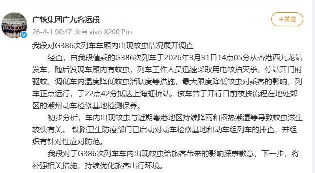 广铁集团广九客运段关于G386次列车车内出现蚊虫给搭客带来的影响深表歉意,下一步,将补强揣测步伐,握续优化搭客出行环境。
