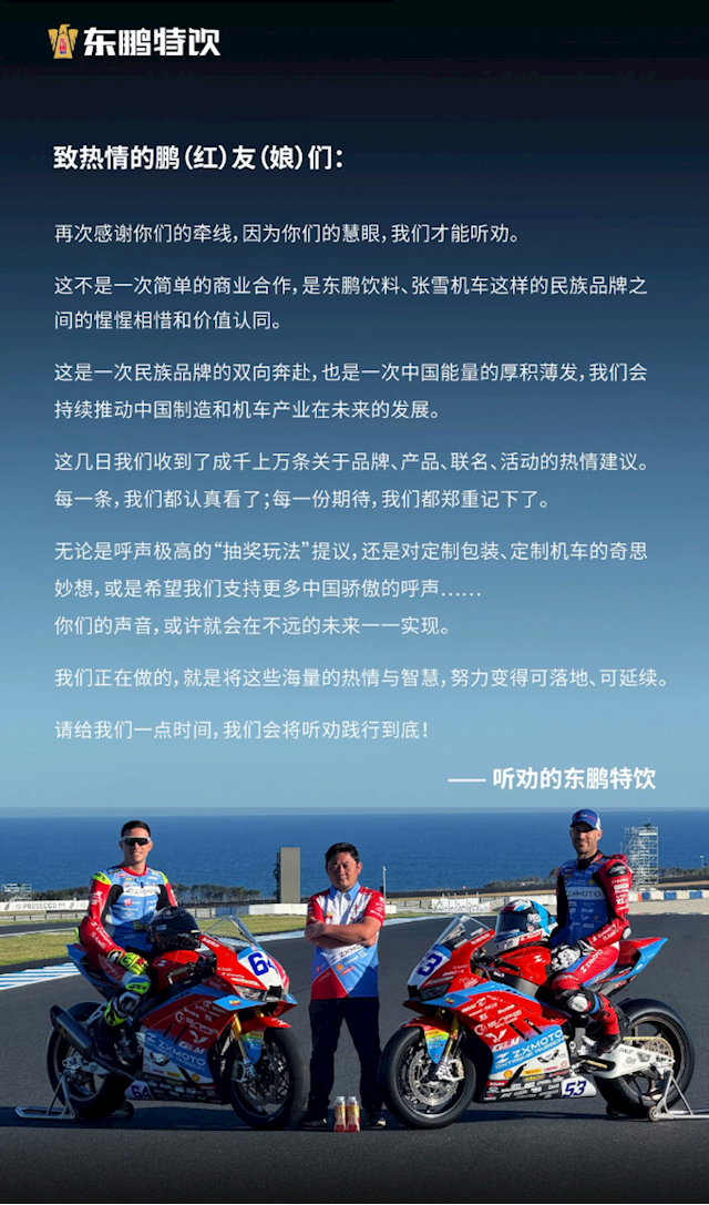 在张雪机车强势两连冠后,东鹏特饮也幽默进行了薪金:“鹏哥这次是真听劝了”,并感谢当初网友的穿针引线,同期还示意会厚爱商量网友们干系定制包装、定制机车的提议。