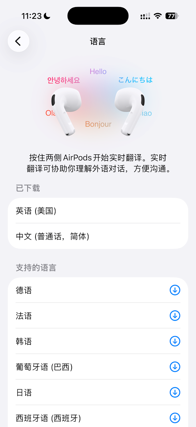 快科技进一步实测还发现,在开启苹果智能后,AirPods将守旧及时翻译功能,用户只需按住耳机两侧即可快速启用。