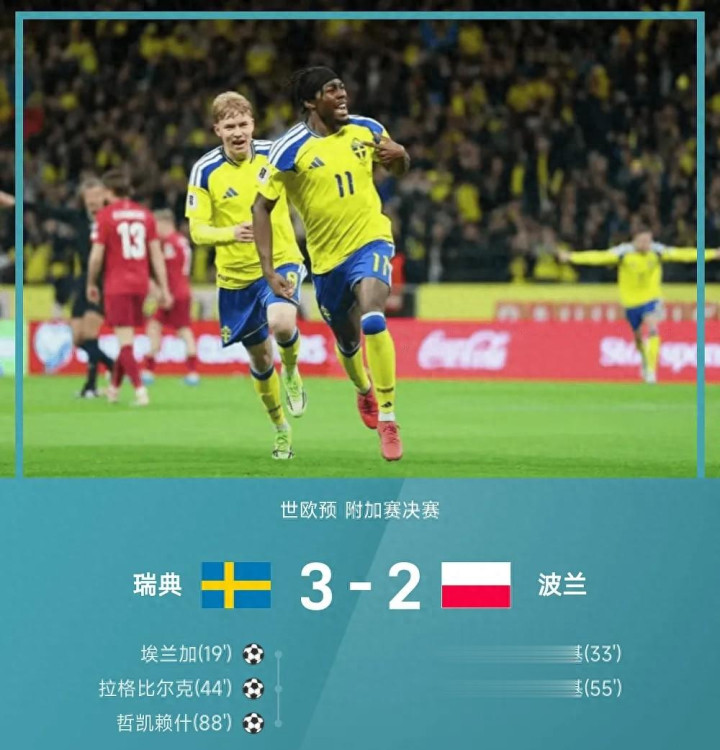 4月01日 26赛末世欧预附加赛决赛,瑞典主场迎战波兰。上半场,埃兰加策应阿亚里传球起左脚劲射破门,扎莱夫斯基突入禁区内切射门立功,拉格比尔克策应尼格伦大肆球传中头球破门助瑞典再度取得逾越。易边再战,斯维德斯基策应扎莱夫斯基传球推射佛门射中助波兰再度扳平比分,哲凯赖什终场前补射射中打入绝杀球。全场比赛截止,瑞典3-2波兰,晋级好意思加墨宇宙杯。宇宙杯小组赛,瑞典与荷兰、日本、突尼斯同组。