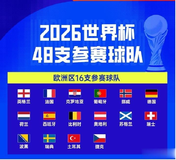 这么,跟着欧洲区世初赛范畴也一齐出炉,参加全国杯的欧洲球队一齐16支球队也随之产生,具体名单如下: