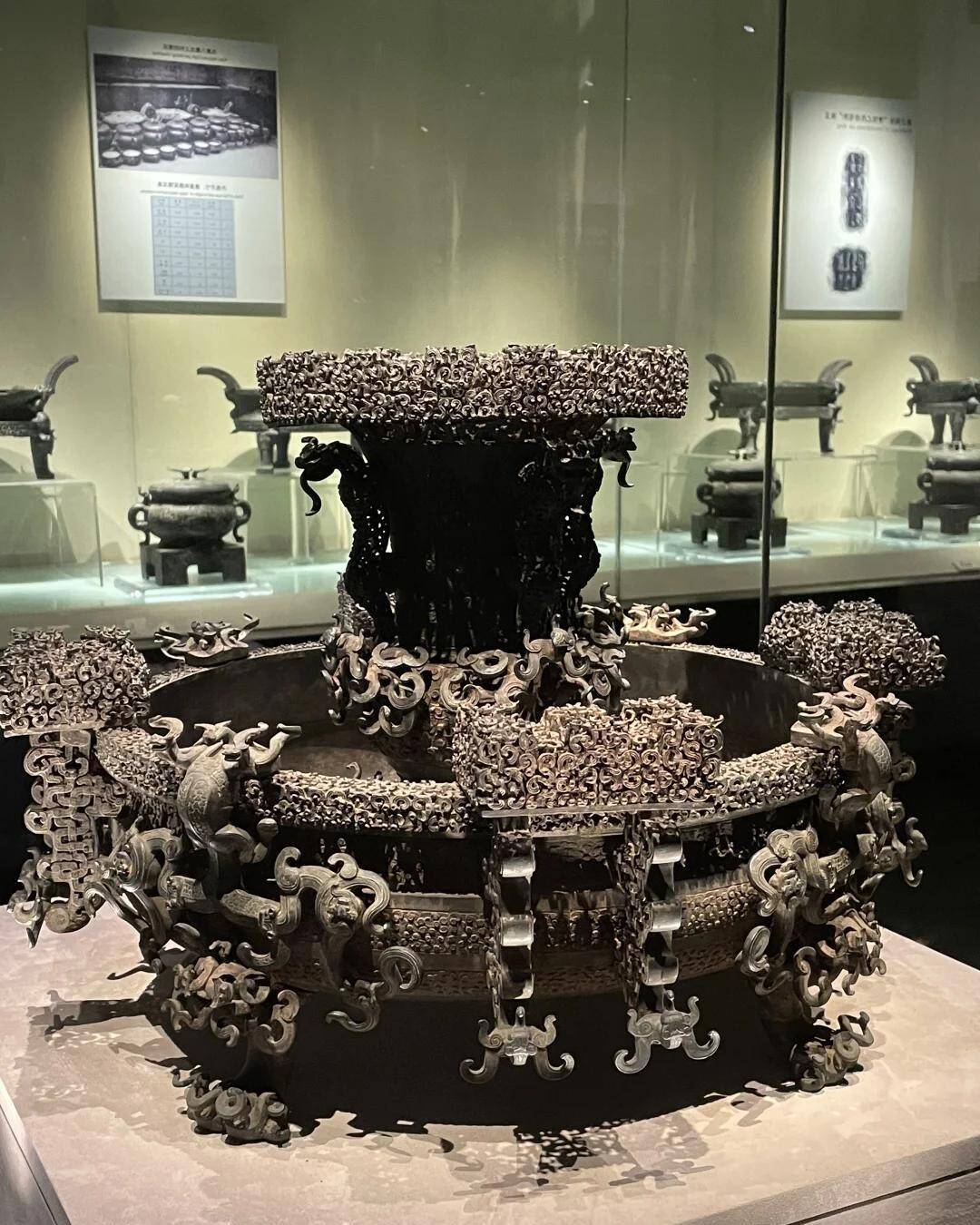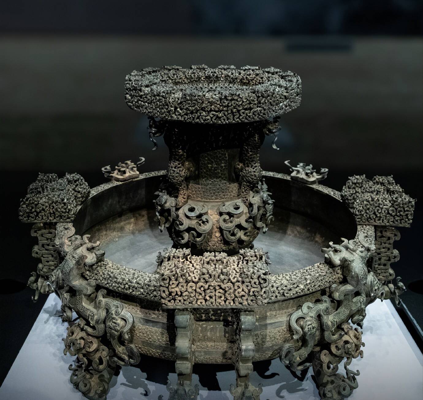 该盘接受失蜡法锻造的青铜重器,84件部件焊合拼装,564条蟠龙、240个蟠螭镂空交汇。