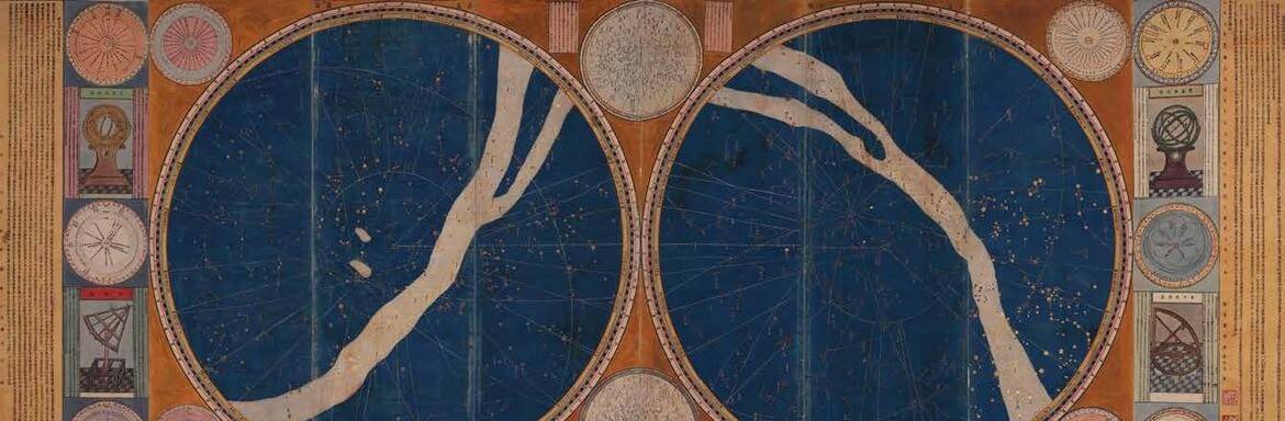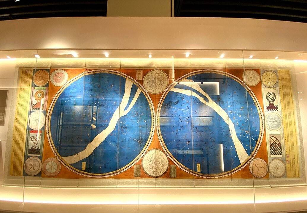 其基底为木版墨印,再由宫廷画师以自然矿物状貌手工填色,星空以深蓝为底,象征深广天穹;1812颗恒星以纯金粉逐少量染。