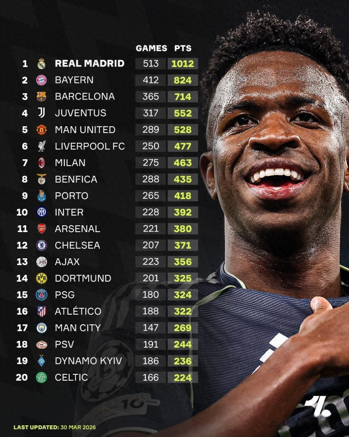 欧冠历史积分榜里,皇马一共缔造513场赛事,累计拿下1012分,稳稳抢占榜首,和第二名拜仁慕尼黑拉开了快要200分的差距。拜仁本人亦然欧洲顶尖权门,黄金城出战412场获利824分,实力早已顶尖,可放到皇马眼前,差距依旧一目了然。